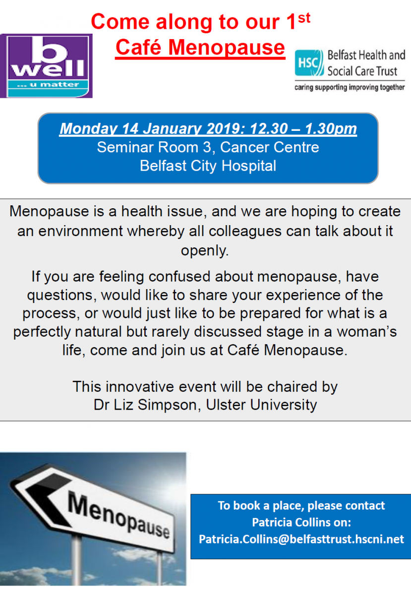 Belfast City Hospital are hosting their first Café Menopause next Monday the 14th of January.