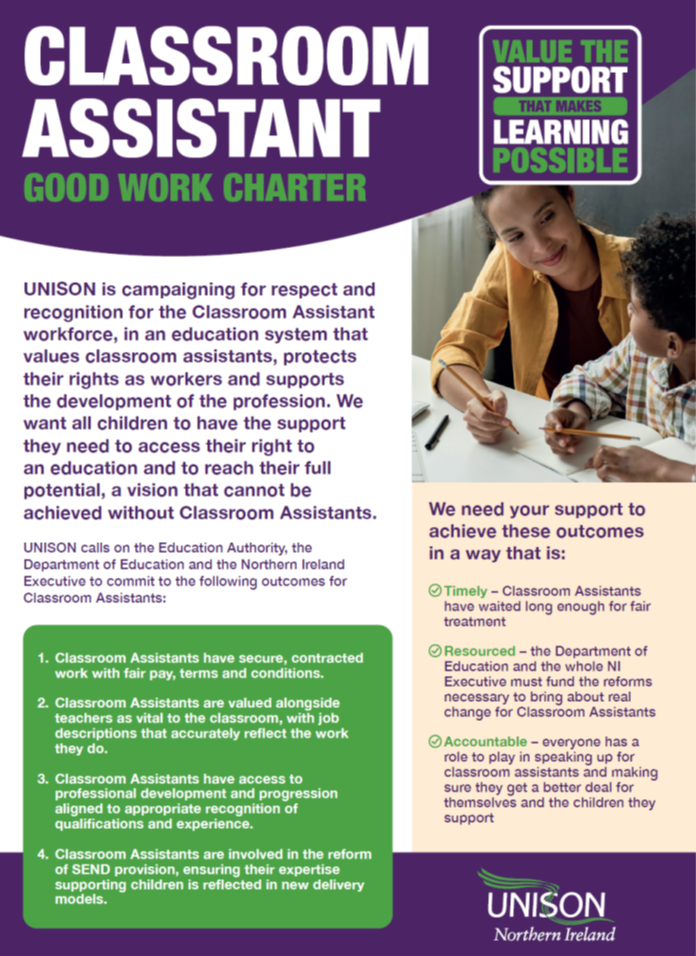 UNISON calls on the Education Authority, the Department of Education and the Northern Ireland Executive to commit to the following outcomes for Classroom Assistants:
