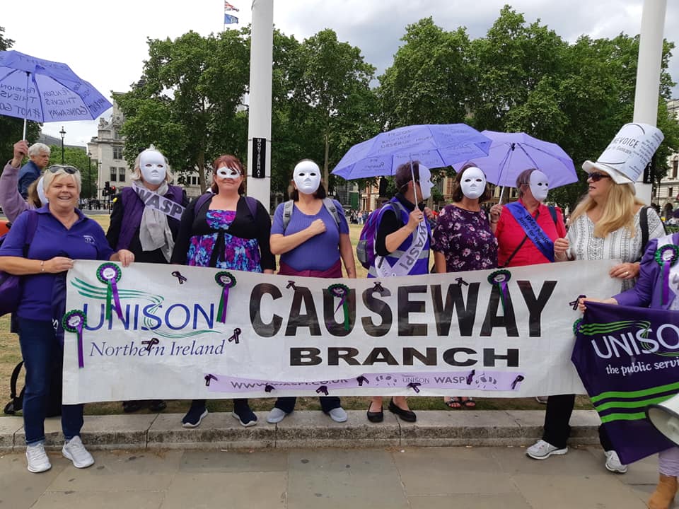 WASPI campaigners from UNISON NI are protesting state pension reforms at the High Court in London where a judicial review is currently underway.